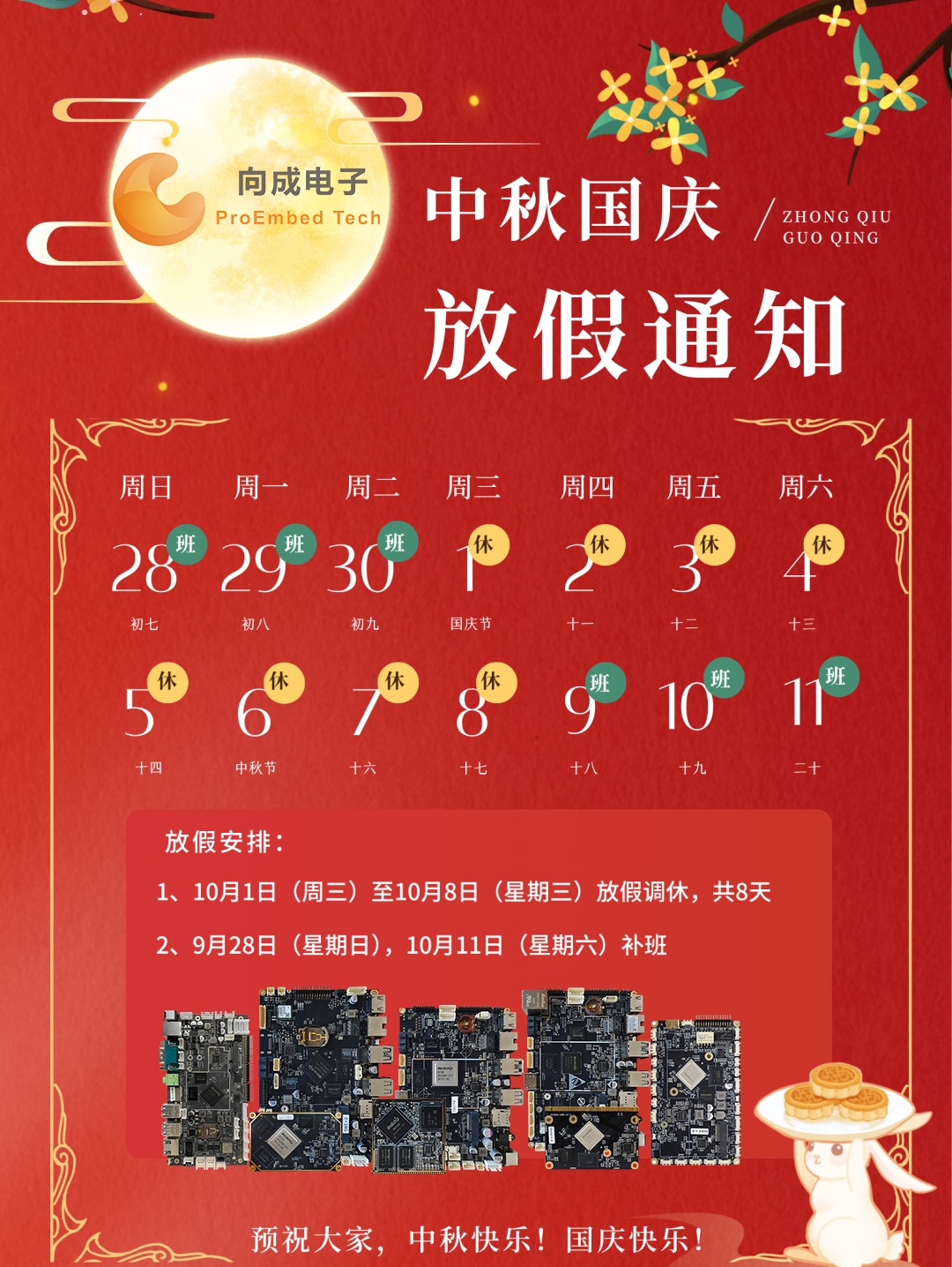根據(jù)國務(wù)院辦公廳《關(guān)于2025年部分節(jié)假日安排的通知》,結(jié)合我司工作情況,現(xiàn)將2025年國慶節(jié)、中秋節(jié)放假及相關(guān)安排如下:賦能工業(yè)未來:向成電子XC3576H工控主板多領(lǐng)域應(yīng)用前景